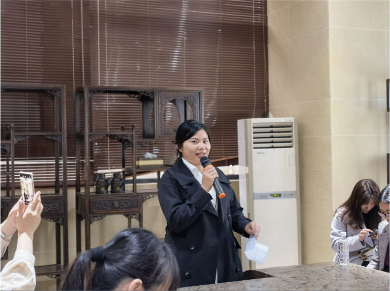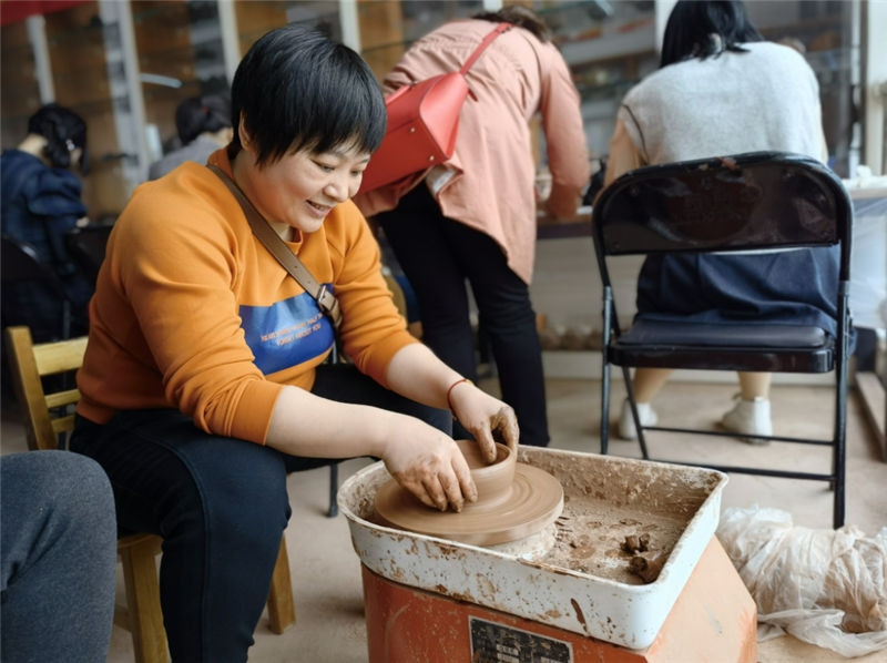 坭興陶文化體驗活動分為文化知識講解和制作體驗兩部分。文化館負責人詳細講解欽州市泥興陶歷史文化、成就,并帶領女職工們參觀陶器燒制現(xiàn)場和泥興陶成品,介紹泥興陶制作過程以及煙塵處理等知識。在陶藝制作體驗環(huán)節(jié),女職工們認真觀摩陶藝老師的操作演示拉胚和雕刻,并有模有樣的制作,雖然制作出來的作品相對粗糙,但大家如獲至寶。