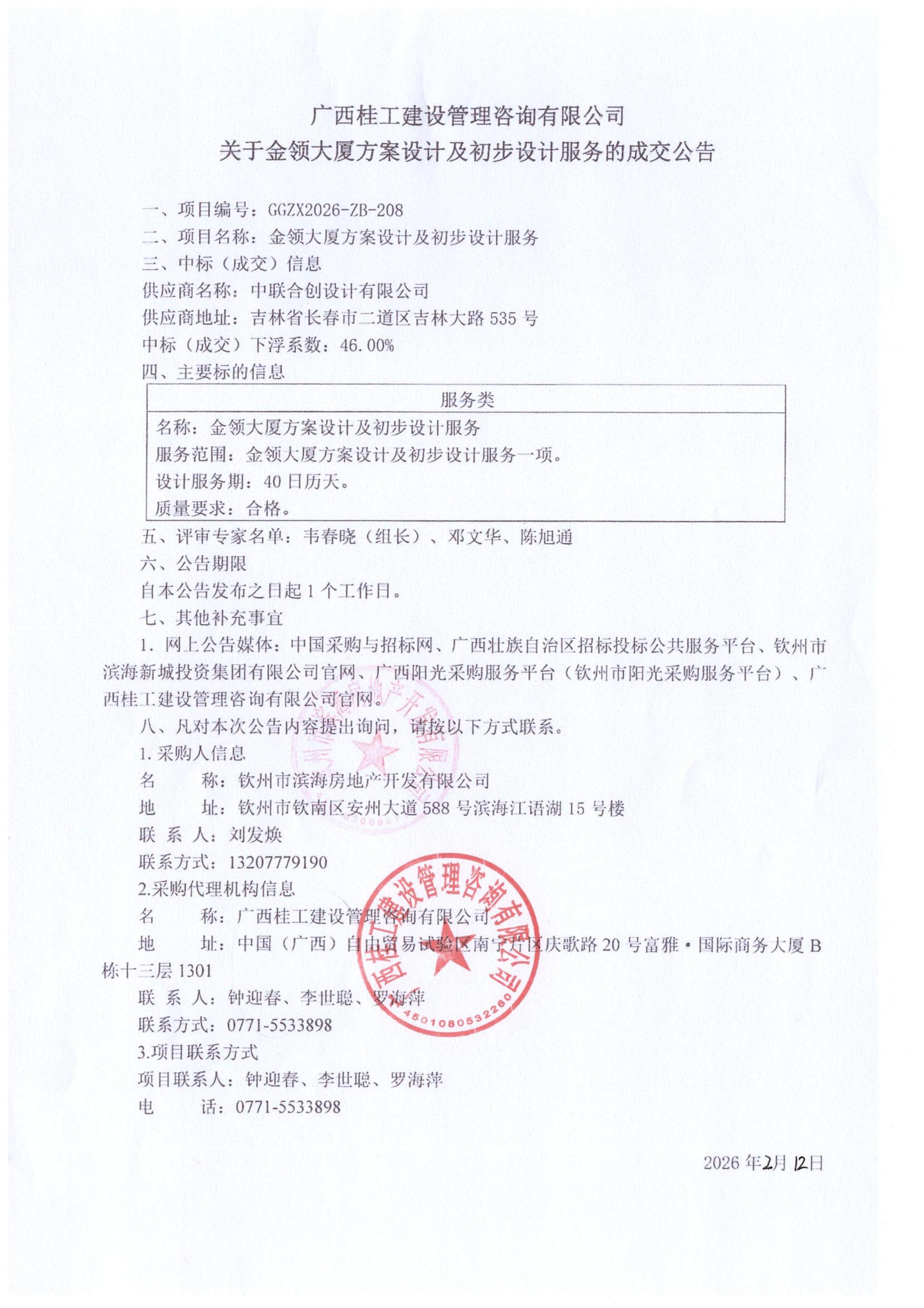 廣西桂工建設(shè)管理咨詢有限公司關(guān)于金領(lǐng)大廈方案設(shè)計及初步設(shè)計服務(wù)的成交公告