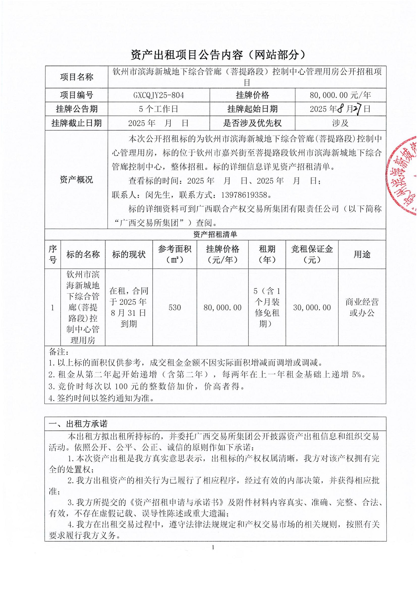 欽州市濱海新城地下綜合管廊(菩提路段)控制中心管理用房公開招租項目(GXCQJY25-804)成交公告