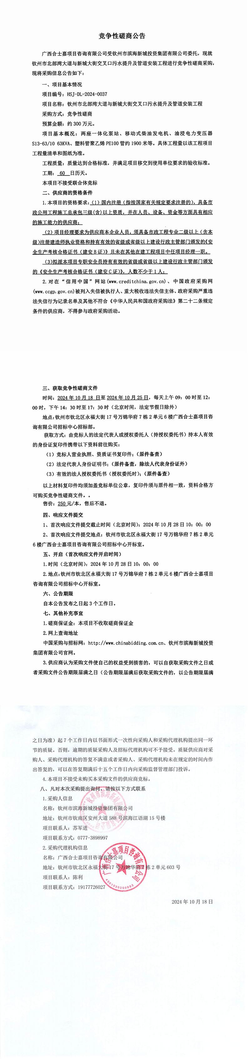 北部灣大道與新城大街交叉口污水提升泵及管道工程招標公告