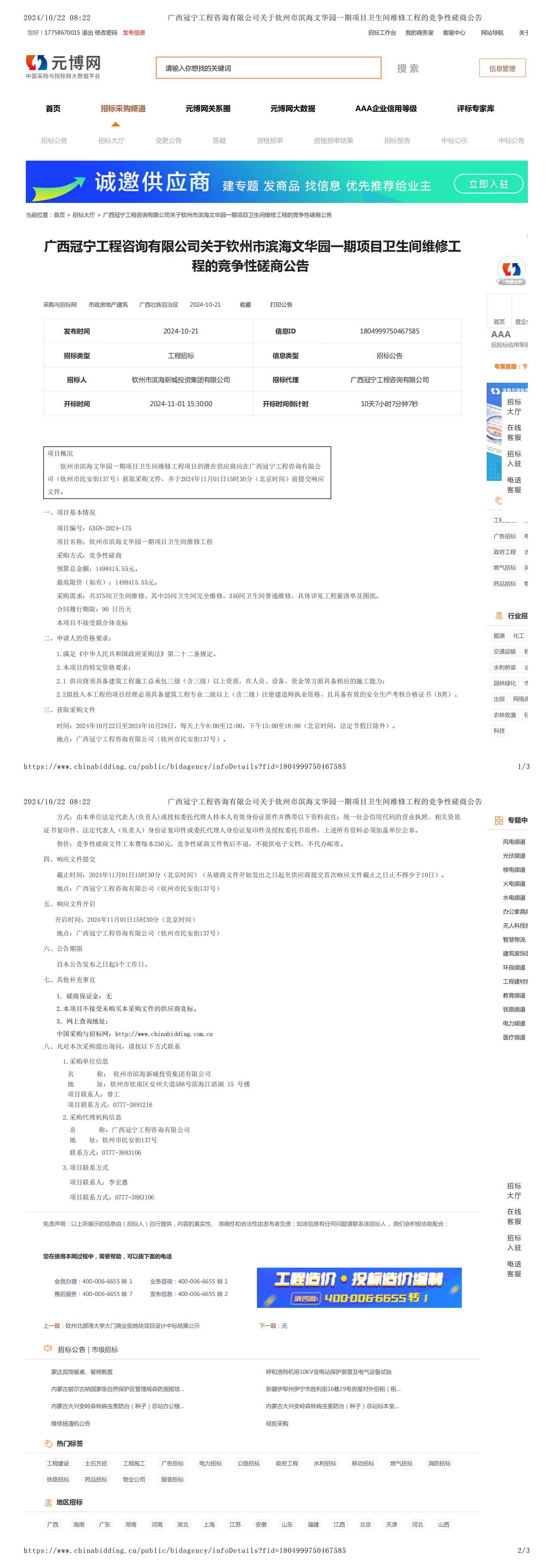 廣西冠寧工程咨詢有限公司關于欽州市濱海文華園一期項目衛(wèi)生間維修工程(項目編號:GXGN-2024-175)成交公告