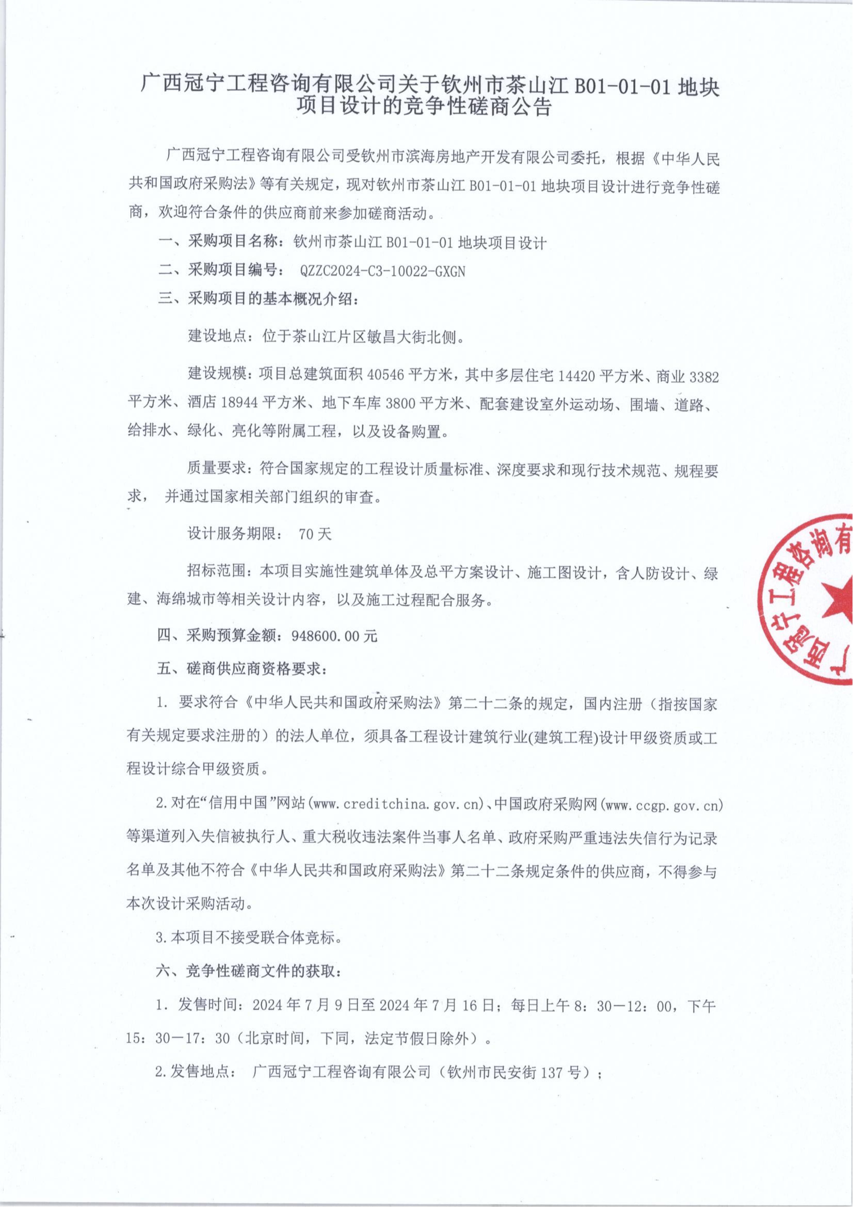 廣西冠寧工程咨詢有限公司受欽州市濱海房地產(chǎn)開發(fā)有限公司的委托,于2024年7月19日就欽州市茶山江B01-01-01地塊項目設(shè)計項目采用競爭性磋商方式進(jìn)行。按規(guī)定程序進(jìn)行了競爭性磋商,現(xiàn)就本次競爭性磋商的結(jié)果公告如下: 一、采購項目名稱:欽州市茶山江B01-01-01地塊項目設(shè)計 項 目 編 號 :QZZ...