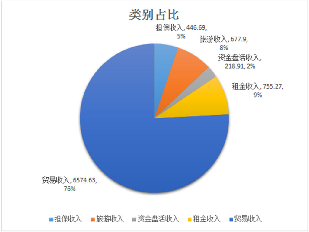 1-10月,集團(tuán)公司經(jīng)營收入為8673.4萬元,同比去年增長337 %。其中:貿(mào)易收入6574.63萬元,占比76%;擔(dān)保業(yè)務(wù)收入446.69萬元,占比5%;資金盤活收入218.91萬元,占比2%;八寨溝旅游收入677.9萬元,占比8%;租賃收入755.27萬元,占比9%。