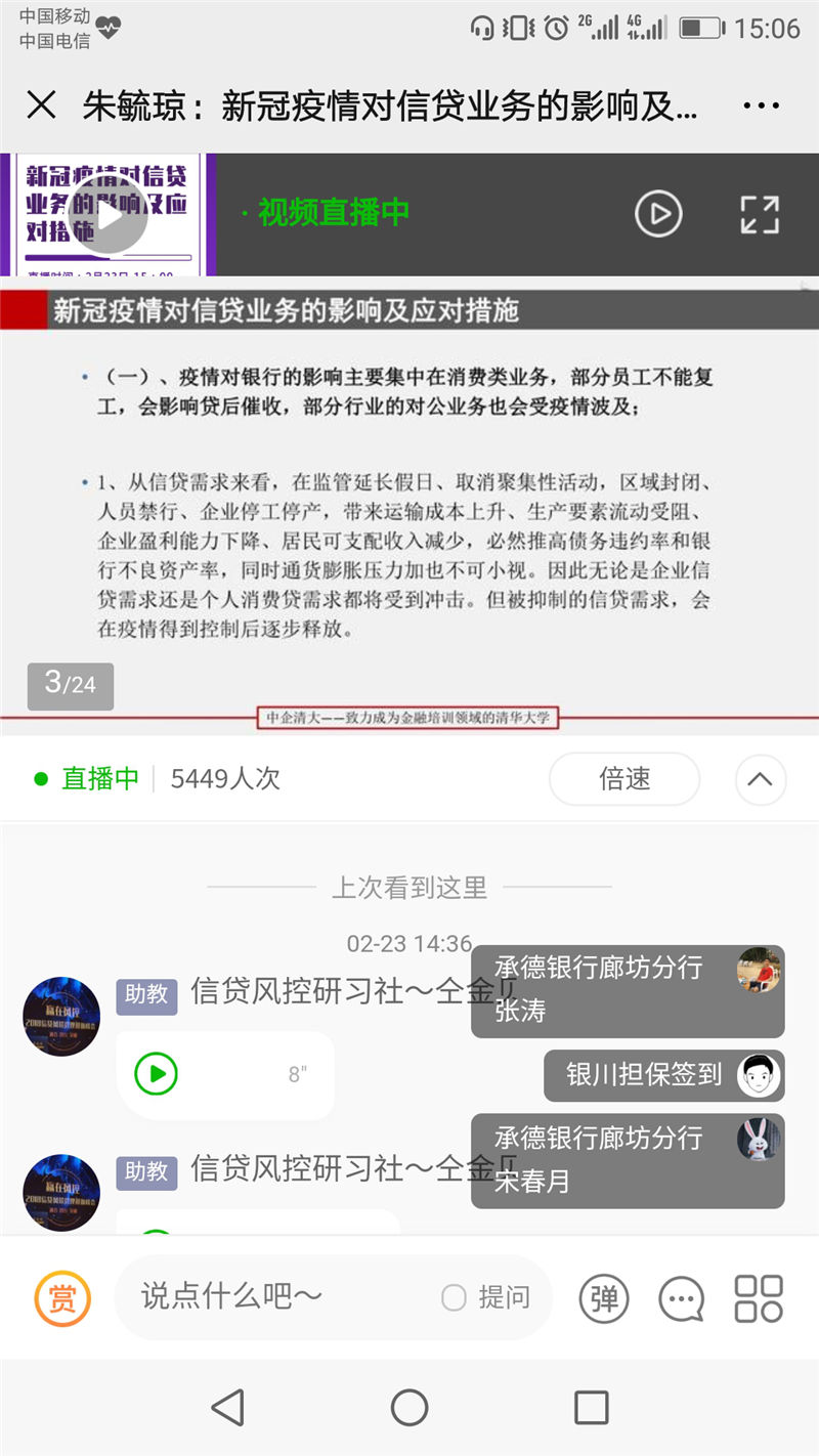 2020年2月23日下午,我公司員工集體參加銀行信貸風(fēng)險(xiǎn)專家朱毓瓊老師主講的“新冠疫情對信貸業(yè)務(wù)的影響及應(yīng)對措施”專題網(wǎng)課。通過本次網(wǎng)課培訓(xùn),系統(tǒng)地學(xué)習(xí)了解新冠疫情對融資擔(dān)保行業(yè)的影響,充分認(rèn)識本次新型冠狀病毒肺炎疫情對融資擔(dān)保行業(yè)的影響和沖擊,以及學(xué)習(xí)各地監(jiān)管部門的最新政策和應(yīng)對措施。