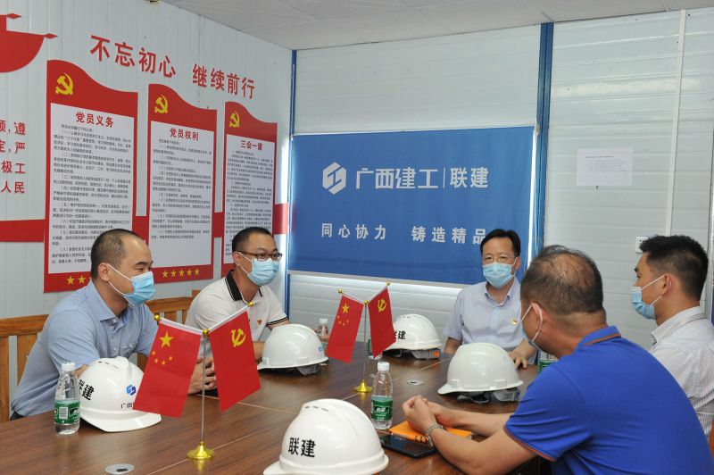 莫錦榮(中)在項(xiàng)目部黨員活動(dòng)室開展座談