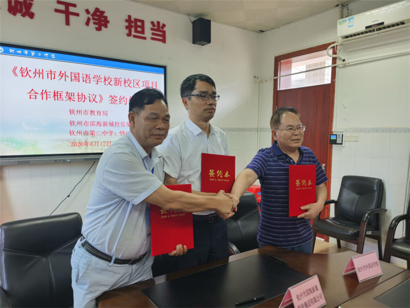 6月12日,我集團公司與欽州市第二中學、市外國語學校合作項目——欽州市外國語學校新校區(qū)的合作簽約儀式在欽州市隆重舉行。簽約儀式上,集團公司副總經(jīng)理劉一材、欽州市第二中學校長劉世偉及市外國語學校法人代表謝立作為三方代表簽署了《欽州市外國語學校新校區(qū)項目合作框架協(xié)議》,并合影留念。