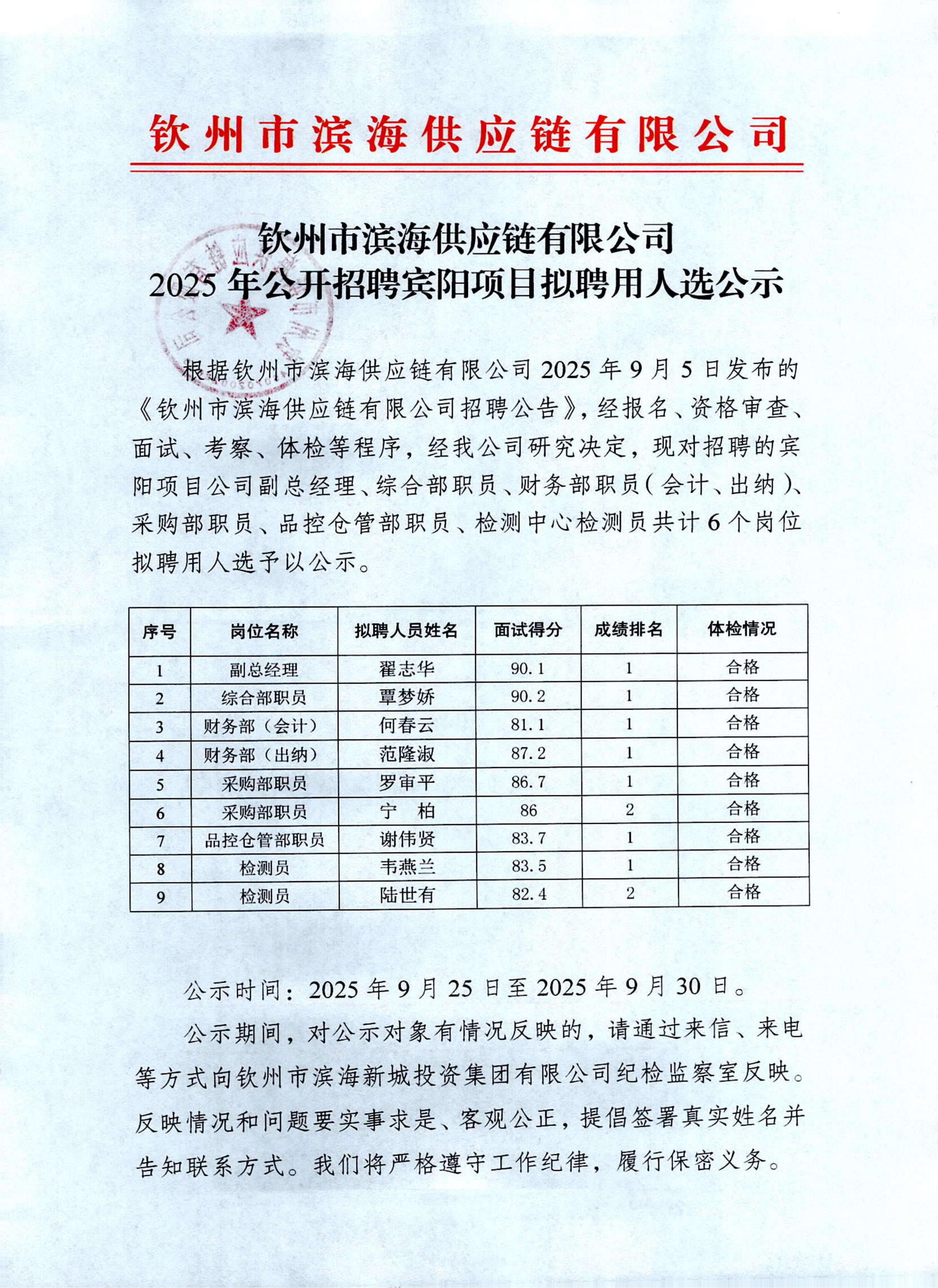 欽州市濱海供應(yīng)鏈有限公司2025年公開招聘賓陽項(xiàng)目擬聘用人選公示
