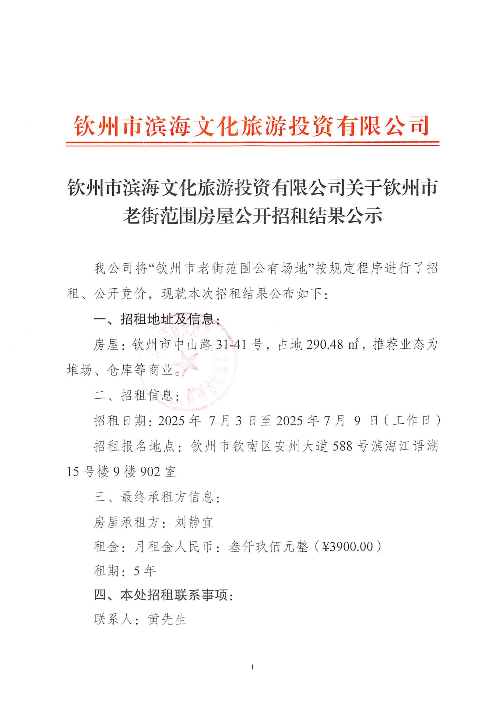 欽州市濱海文化旅游投資有限公司關(guān)于欽州市老街范圍二馬路43號(hào)房屋公開招租結(jié)果公示