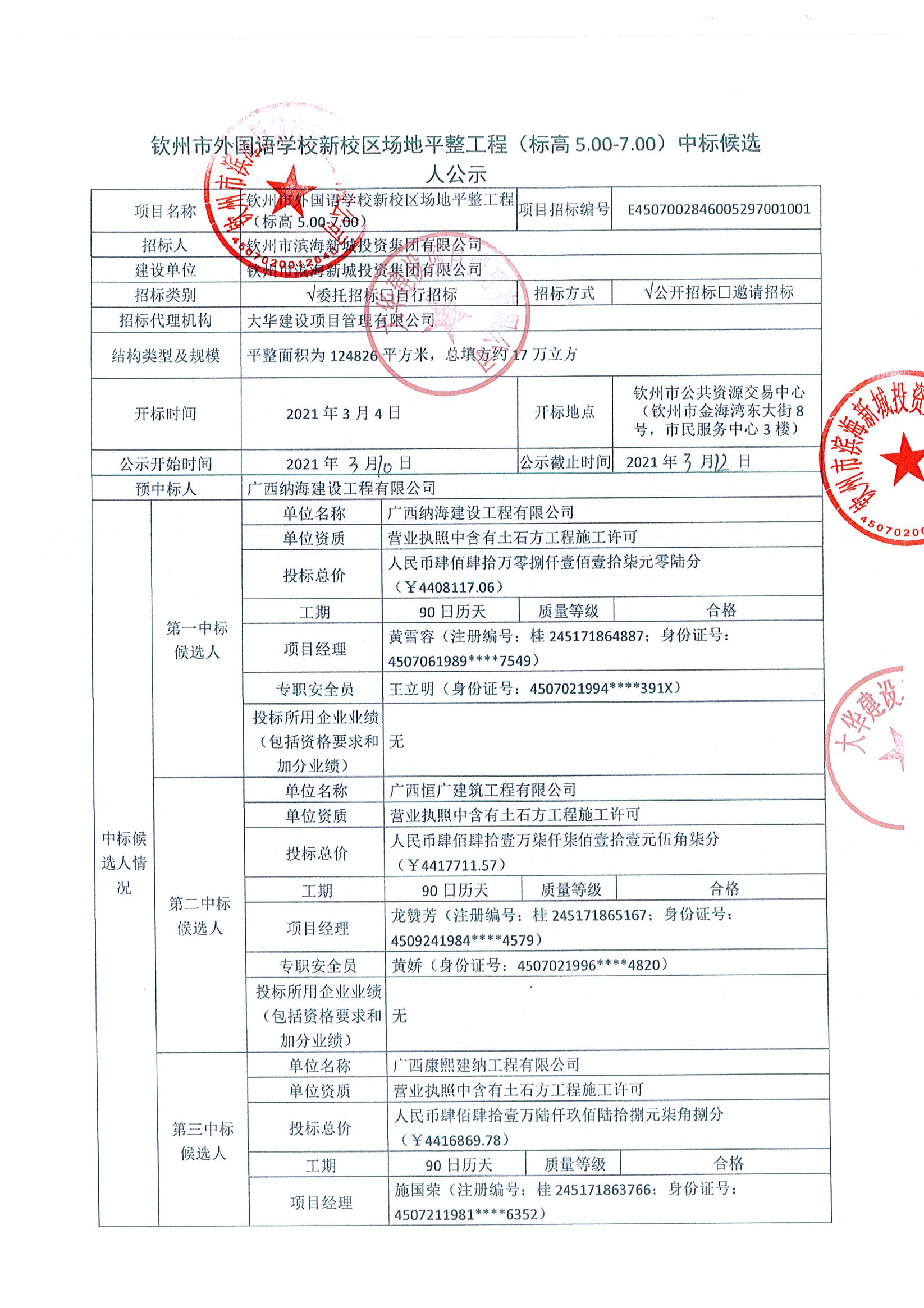 欽州市外國語學校新校區(qū)場地平整工程(標高5.00-7.00)中標候選人公示