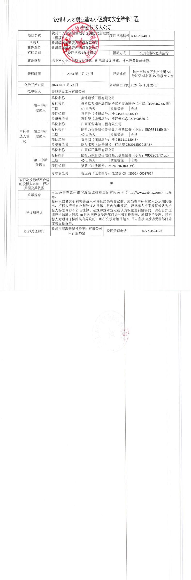 欽州市人才創(chuàng)業(yè)基地小區(qū)消防安全維修工程中標候選人公示