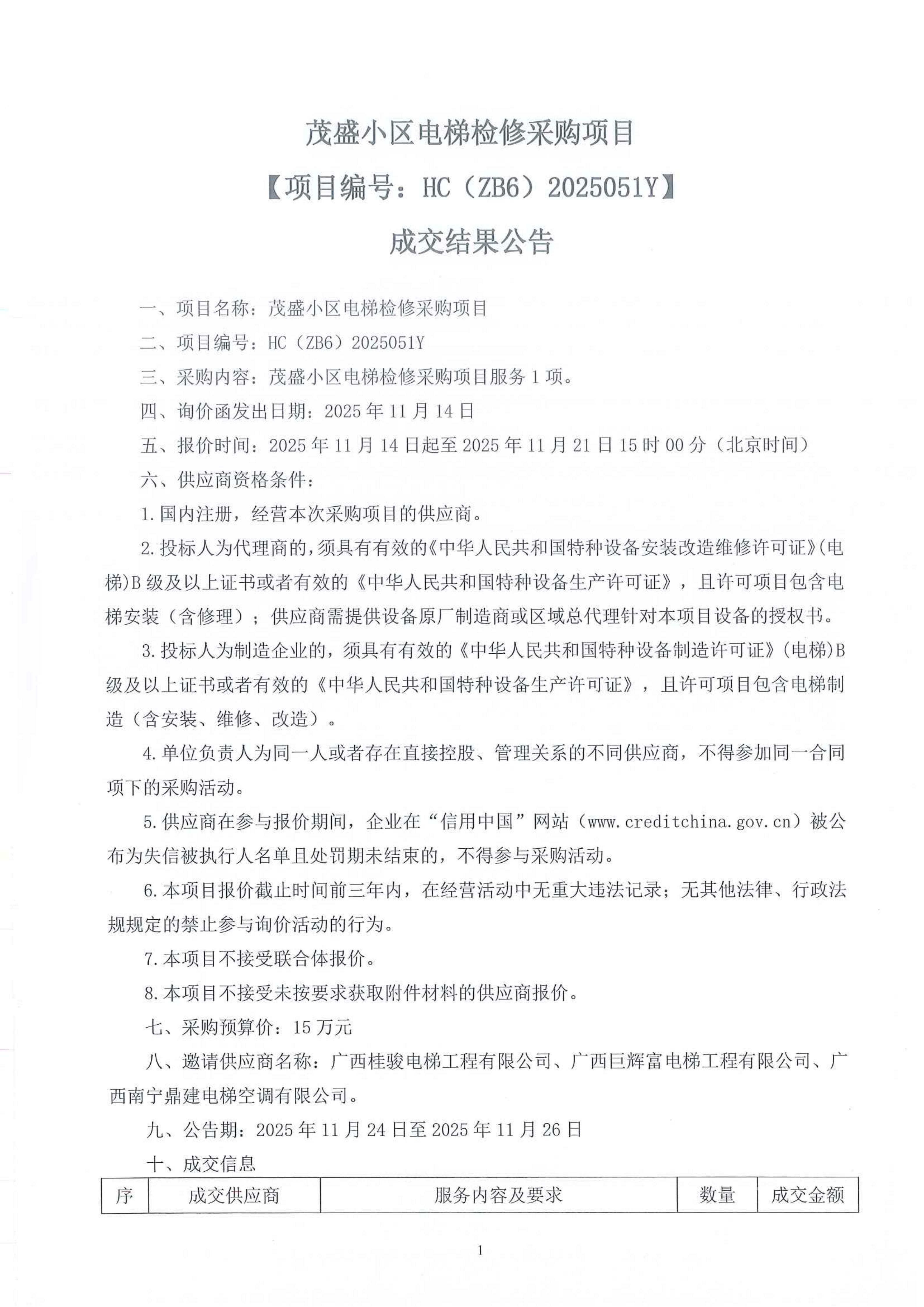 茂盛小區(qū)電梯檢修采購項目【項目編號:HC(ZB6)2025051Y】 成交結(jié)果公告