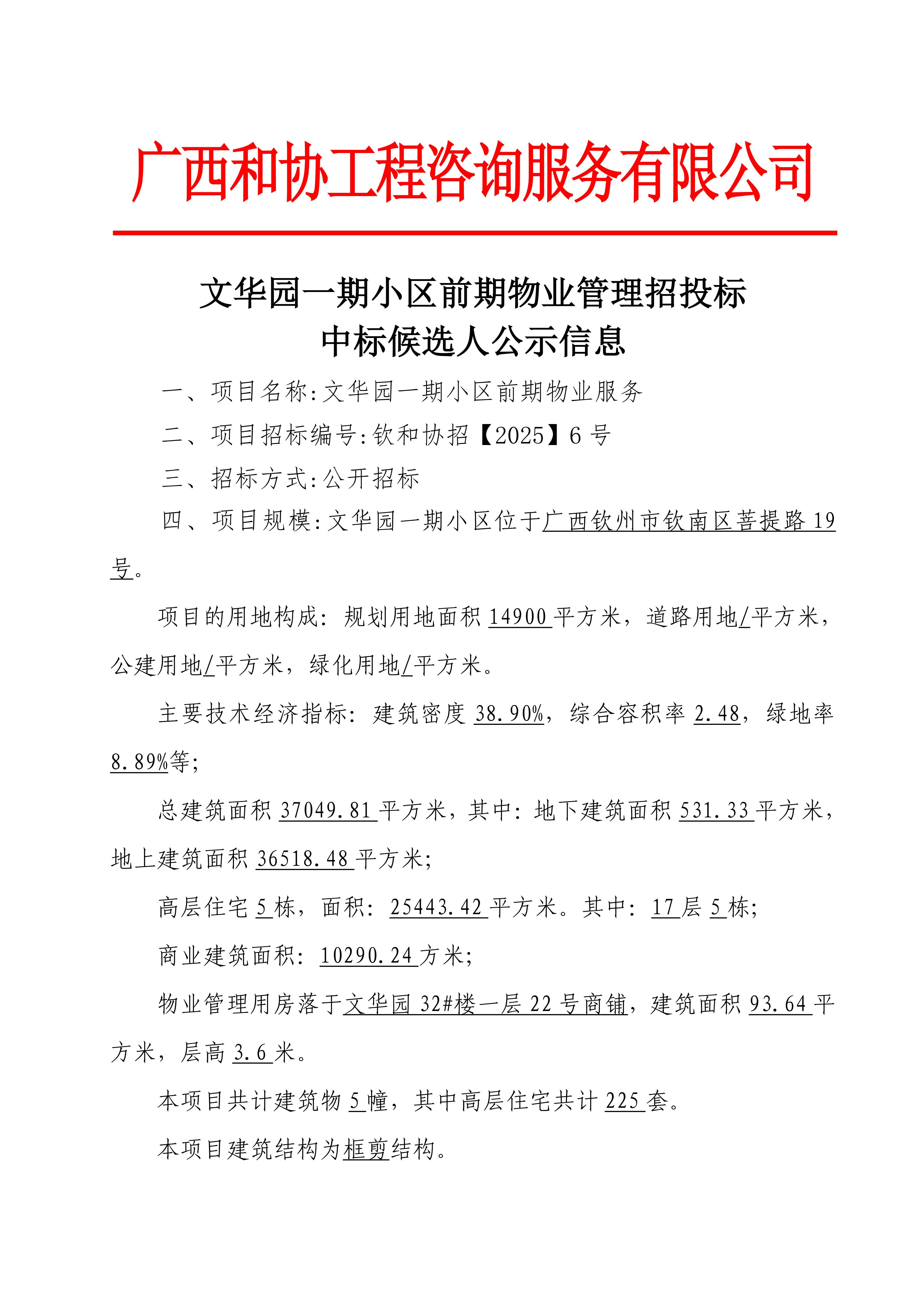 文華園一期小區(qū)前期物業(yè)管理招投標中標候選人公示信息