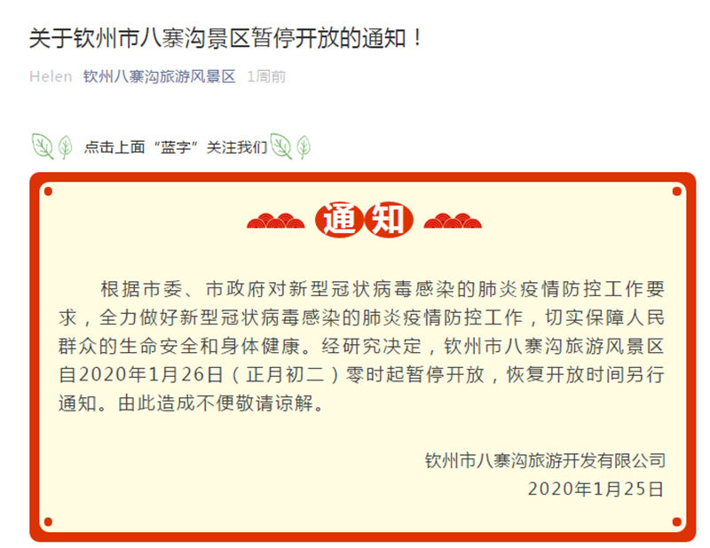 為進(jìn)一步加強(qiáng)八寨溝景區(qū)新型冠狀病毒感染的肺炎疫情防控工作,有效防止疫情經(jīng)旅游途徑傳播,切實(shí)保障游客及公司員工身體健康和生命安全。根據(jù)欽州市委專題擴(kuò)大會(huì)議對(duì)新型冠狀病毒感染肺炎疫情防控工作的部署,欽州市文化廣電體育和旅游局《關(guān)于取消欽州市 2020 年春節(jié)期間文化體育旅游活動(dòng)和暫停相關(guān)文化體育旅游業(yè)務(wù)的通知》,以及欽州市文化廣電體育和旅游局《關(guān)于全市A級(jí)景區(qū)、鄉(xiāng)村旅游區(qū)、農(nóng)家樂(lè)暫停對(duì)外開(kāi)放的通知》,...