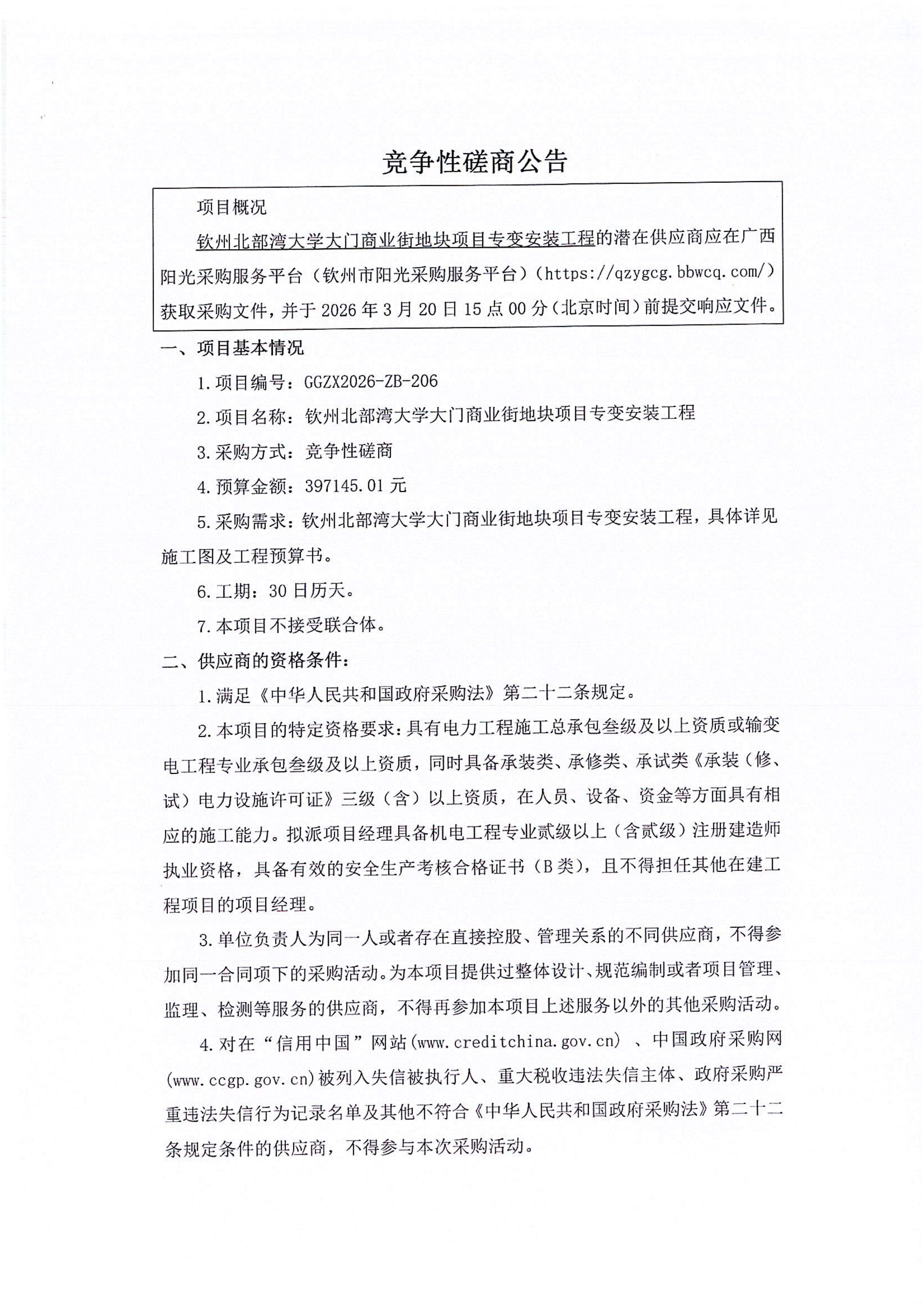 競爭性磋商公告(欽州北部灣大學大門商業(yè)街地塊項目專變安裝工程)