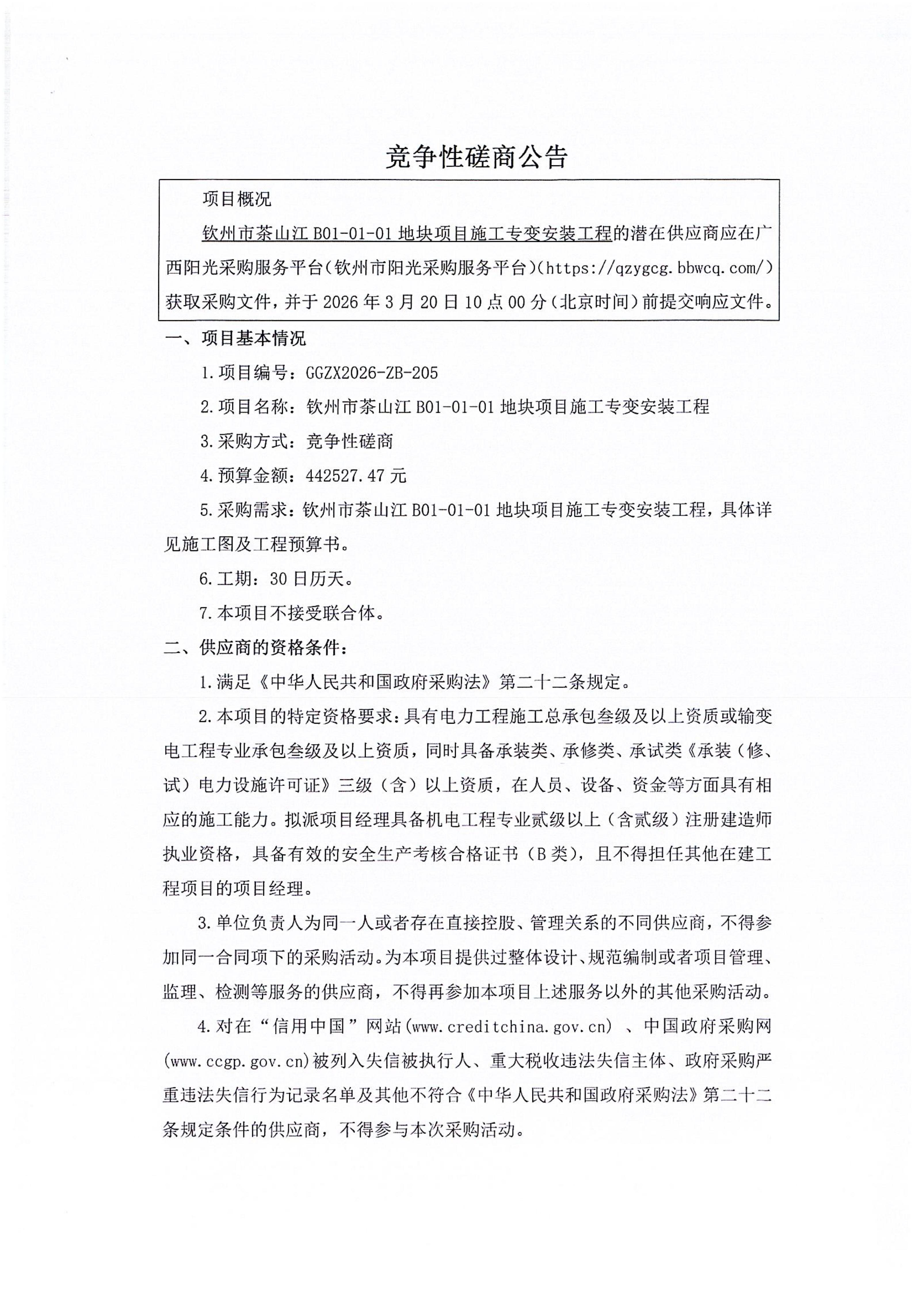 欽州市茶山江B01-01-01地塊項目施工專變安裝工程 競爭性磋商公告