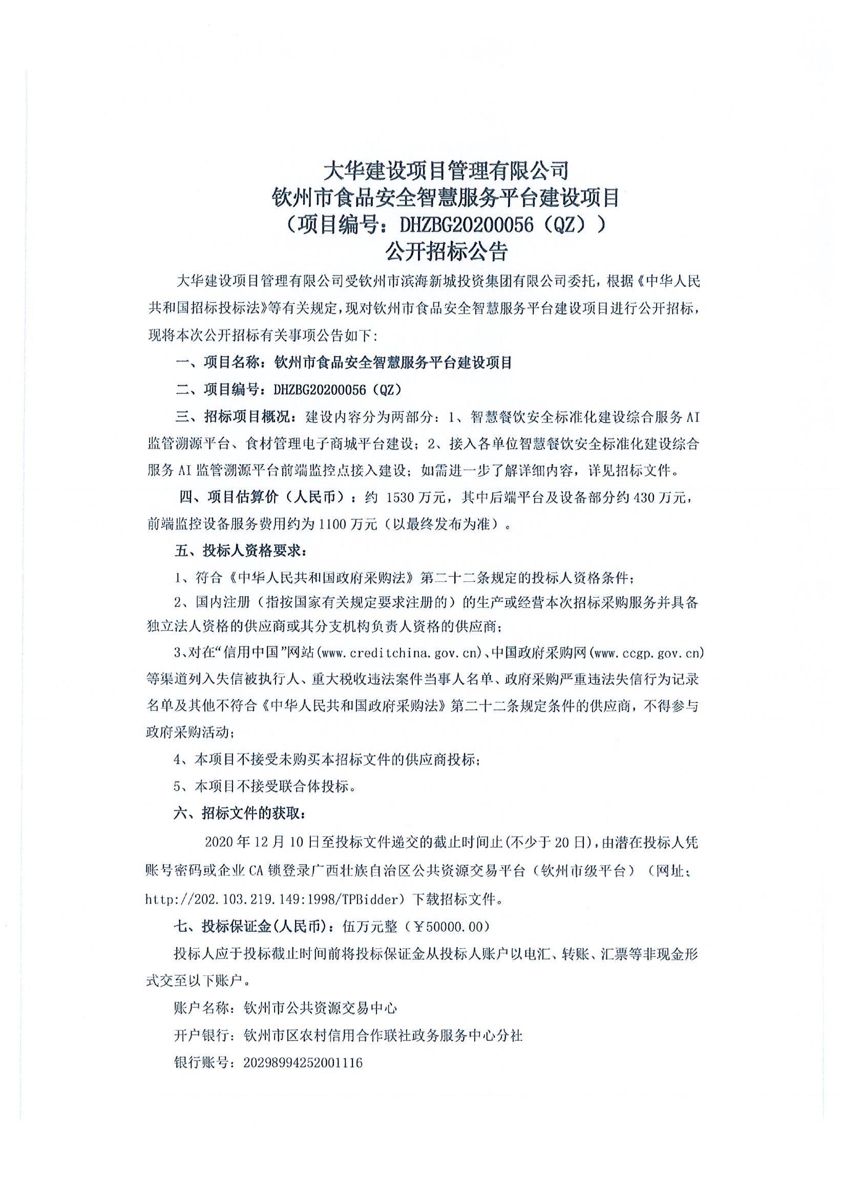 欽州市食品安全智慧服務(wù)平臺(tái)建設(shè)項(xiàng)目公開(kāi)招標(biāo)公告