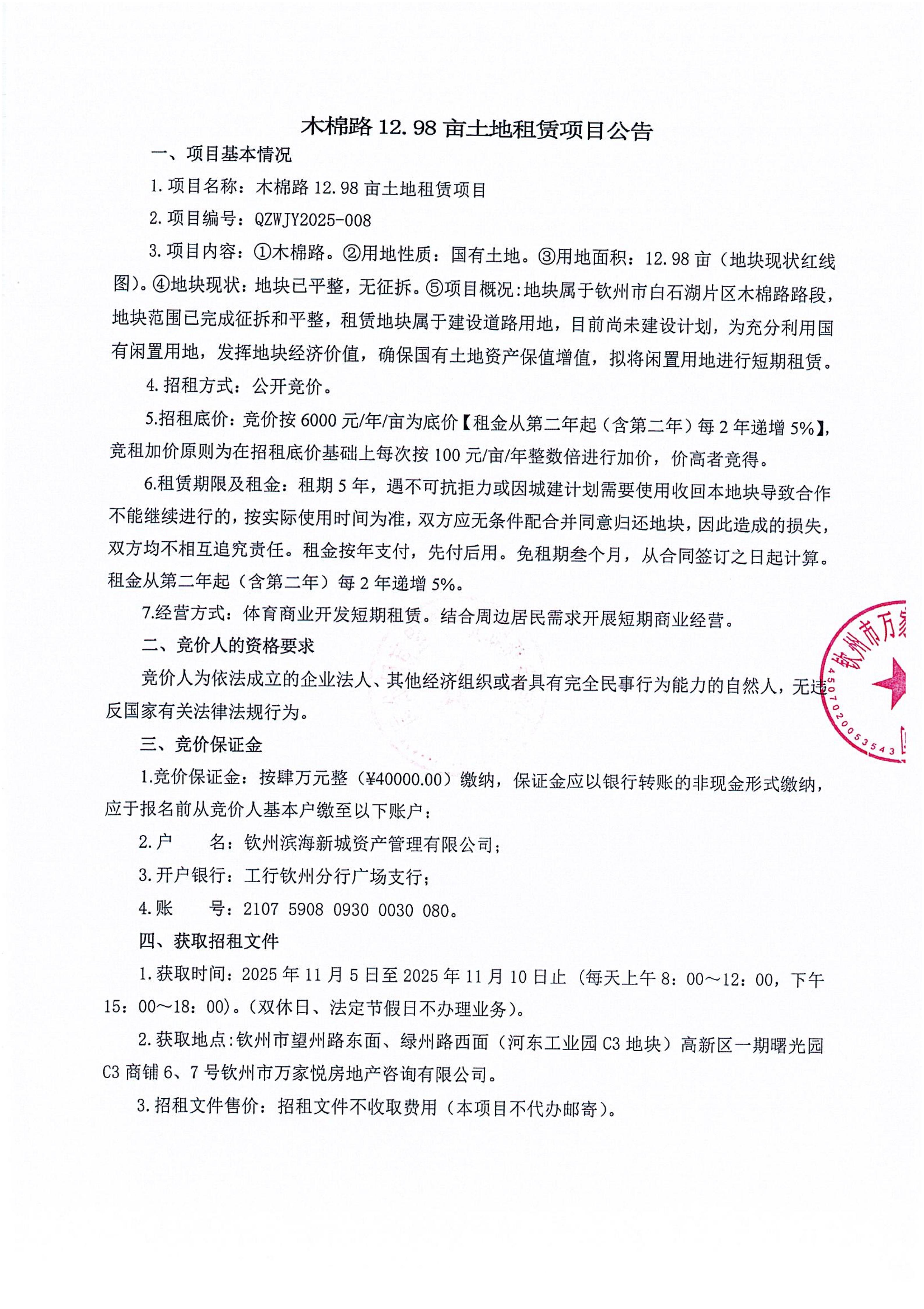 欽州市北部灣大學(xué)東北面6畝地塊公開招租項目