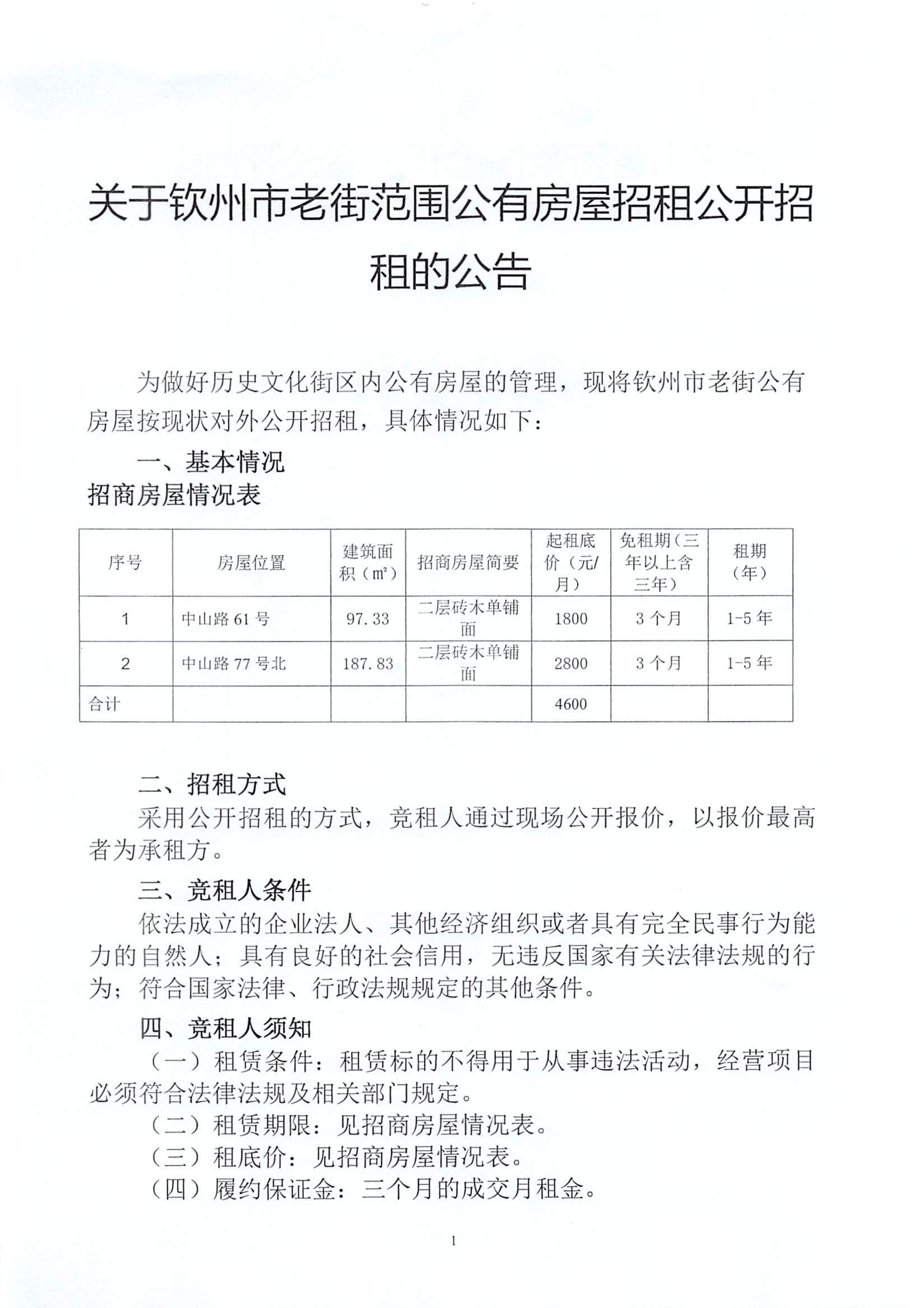 關(guān)于欽州市老街范圍公有房屋招租公開招租的公告