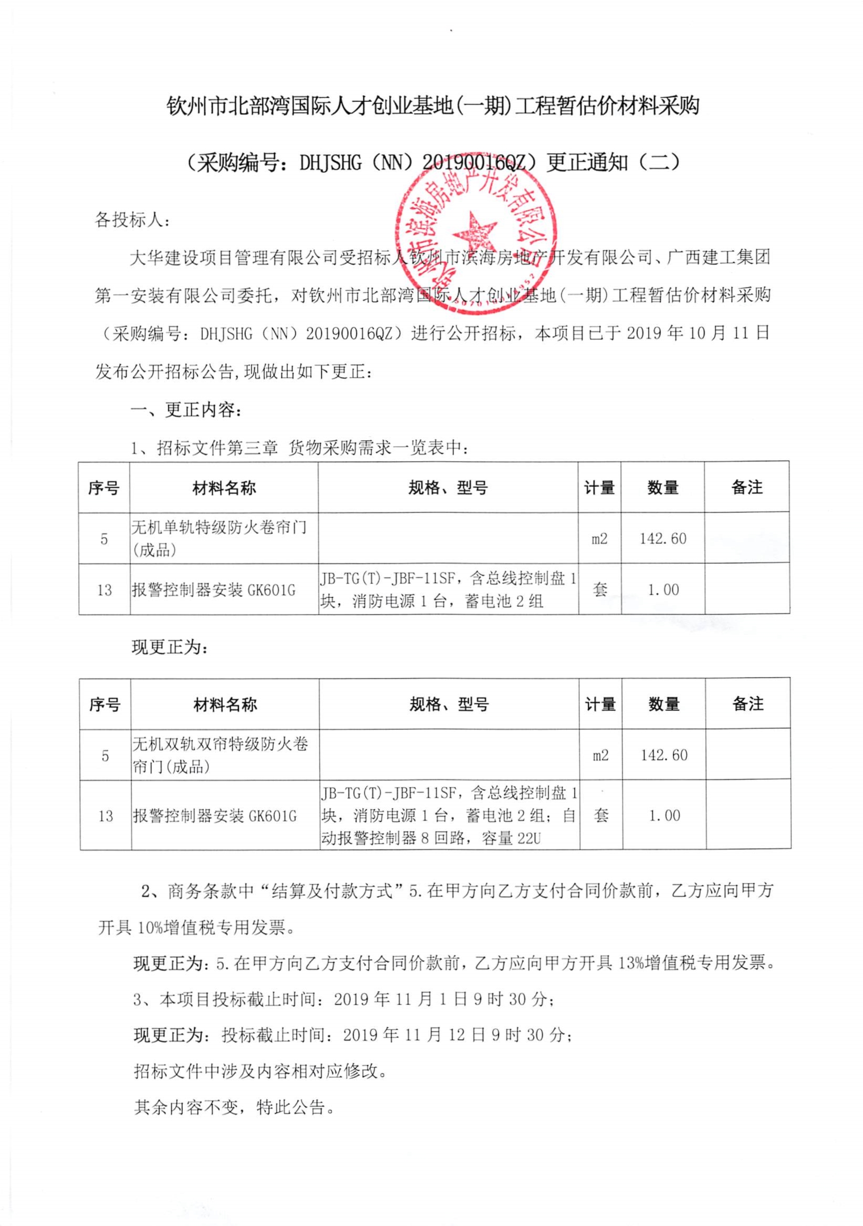 欽州市北部灣國際人才創(chuàng)業(yè)基地(一期)工程暫估價材料采購更正通知(二)
